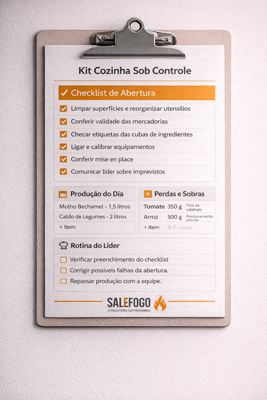 Este material reúne ferramentas simples, práticas e fáceis de aplicar para organizar a abertura e o fechamento da cozinha, estruturar a limpeza por turno, acompanhar a produção, controlar perdas e sobras, organizar as praças e dar mais clareza para a liderança.
